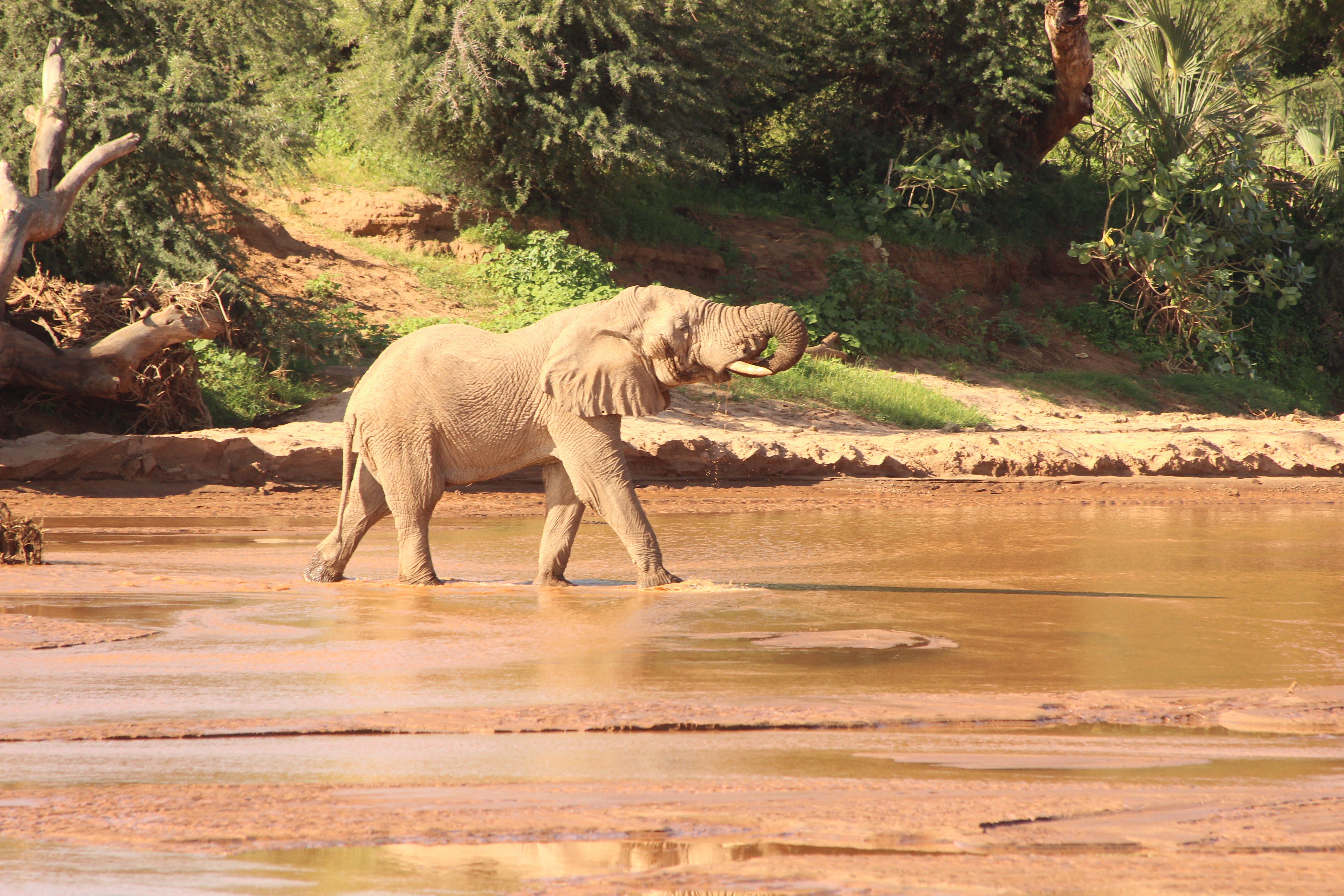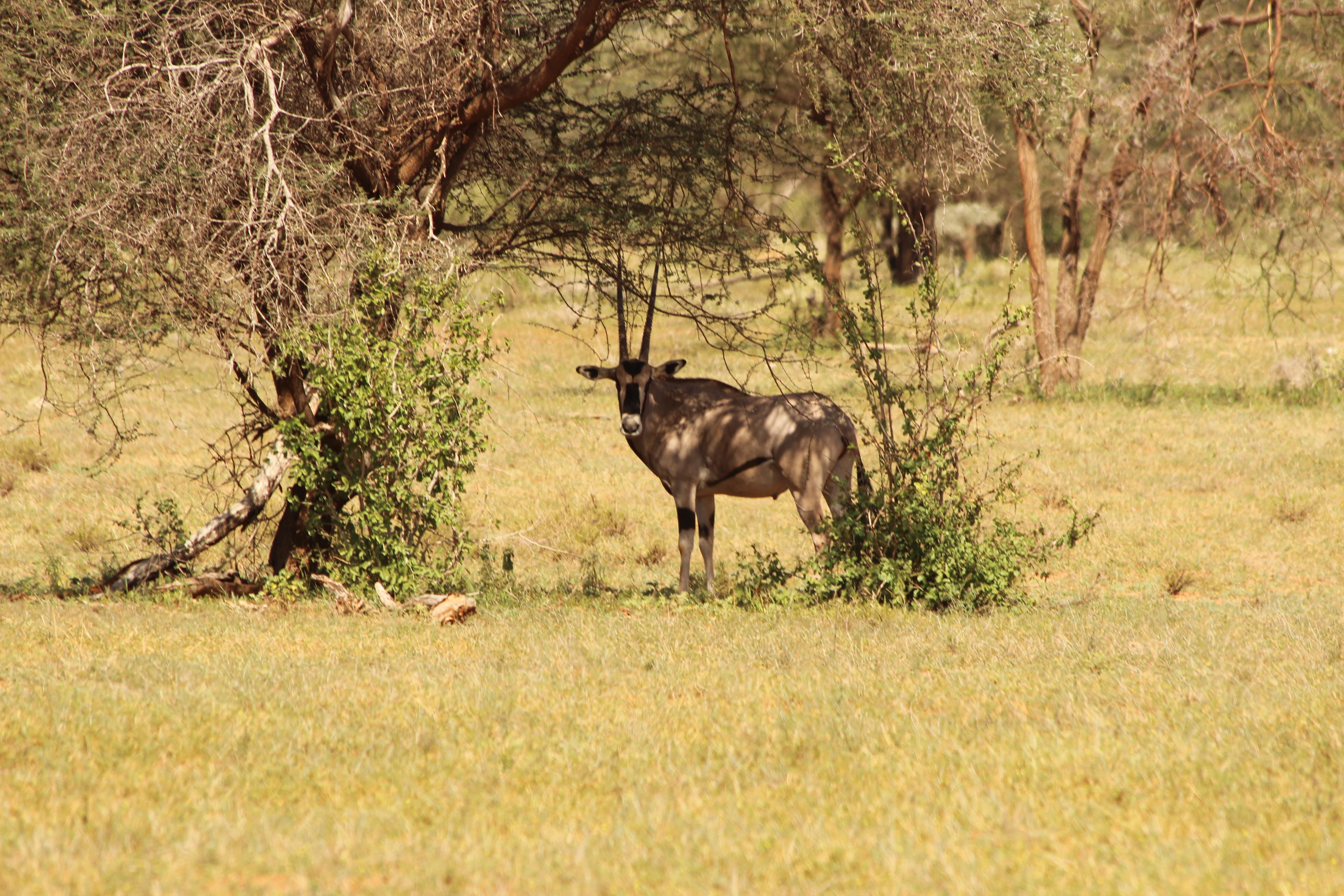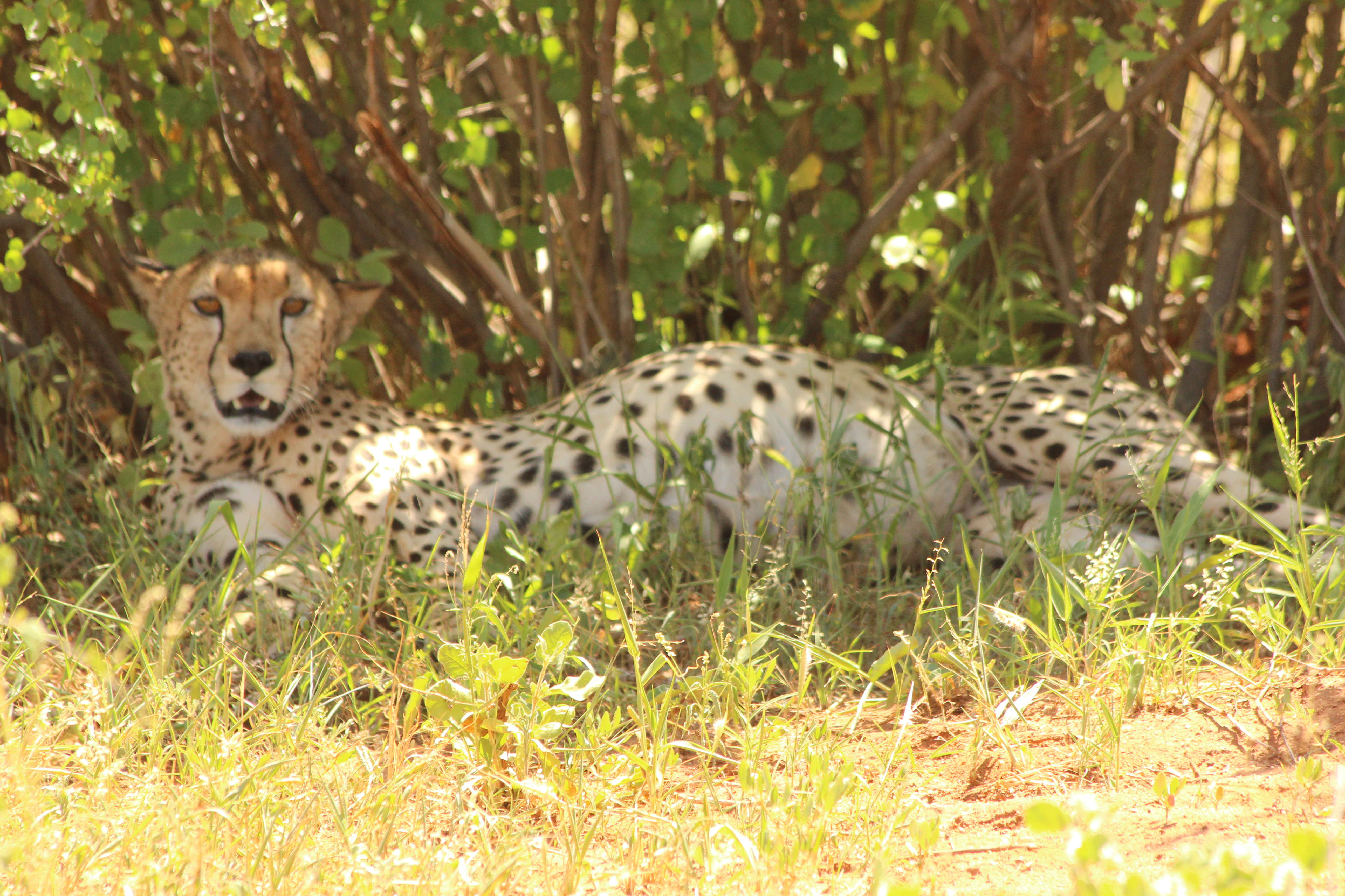 After an exciting pre-breakfast drive, we stopped on the bank of the river. While our driver cooked us an excellent breakfst on the gas cook top that was built into the safari vehicle. We had passion fruit juice and hot tea provided. Sandra and I had a good laugh but you will have to ask her about that. The morning was chilly and the hot bush breakfast was most welcome. Once we had cleaned and packed up we were off for the rest of our morning drive. Spotted a big bull elephant crossing the river and getting a drink. Spotted Impala and Warthogs and a much closer Oryx. The next strange critter is a Gerenuk. I had never heard of them before, sort of looks like a cross between a Giraffe and an antelope. The terrain sort of opened up and we saw our first Reticulated giraffe. Reticulated giraffe, Gerenuk, Somali ostrich, Grevy’s Zebra and Oryx are considered to be the Samburu Special Five and we got to see them all before lunch on the first day! Our amazement wasn’t over yet, before we left for lunch we stumbled upon this fat Cheetah. We feel like he has just eaten a baby gazelle or impala as there was a frantic female nearby.