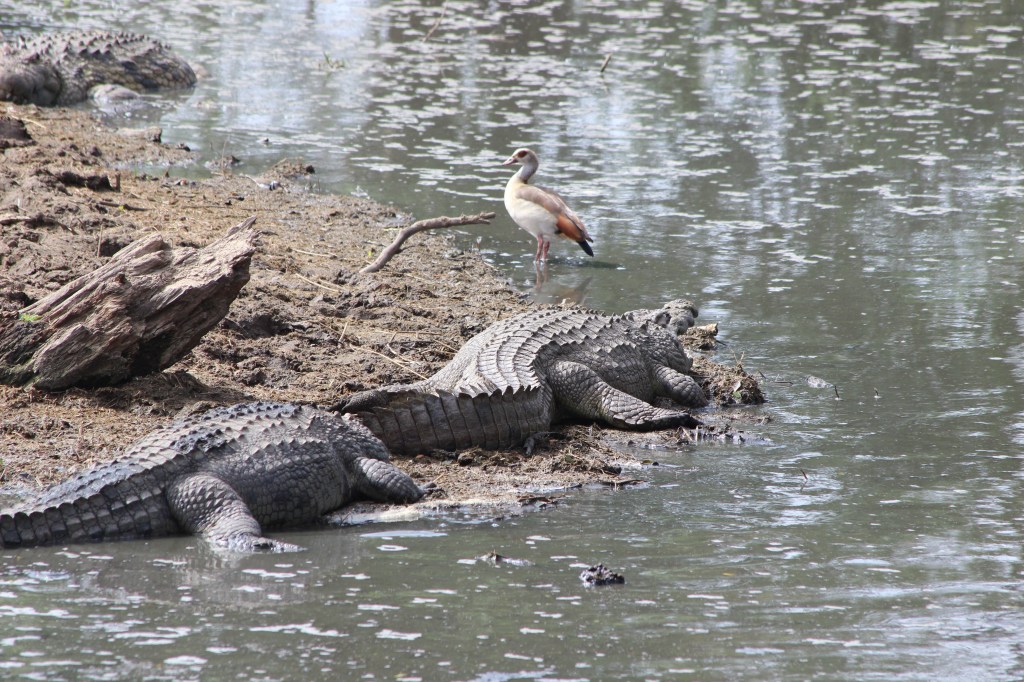 Bird life is abundant too. In front of the crocs is an Egyptian Goose, African Fish Eagle and Marabou Stork.